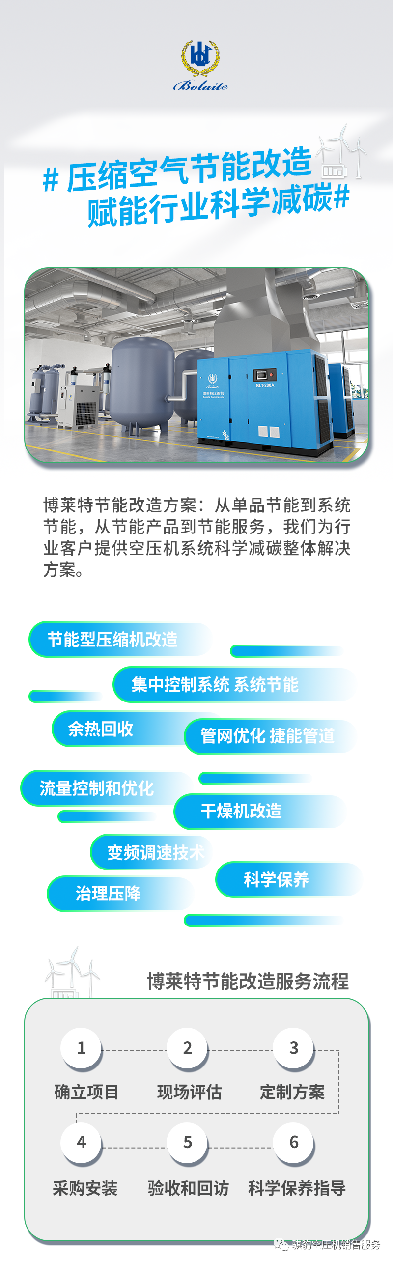 了解博莱特节能改造服务过程项目背景山东某新材料科技有限公司主要从事挖掘机、装载机、压路机、港口设备等工程机械、矿山机械以及零部件的研制、生产、销售和维修。客户需求8年前采购了5台博莱特BLT工频系列空压机,现在由于厂房升级需要完成空压机站房的节能改造。希望从节能表现、价格、售后服务、质量稳定等多个维度,选择合适的空压机品牌和产品。 上一篇: 暂无上一篇 返回列表 下一篇: [世界地球日] 我们只有一个地球 相关资讯 公益日记 | 共享水资源,我们可以做得更多!2020-12-08 博莱特员工热心救老人 不计功与名2015-03-11 工会活动 | 携手共进 未来可期——博莱特工会活动小记2020-06-15 关注未来 回馈社会——“博莱特奖学金”项目正式启动2012-11-19 案例 | 博莱特空压机助力煤炭行业2020-12-09 实况 “革命尚未成功,同志仍需努力”,这趟拓展活动,励志!2019-01-10