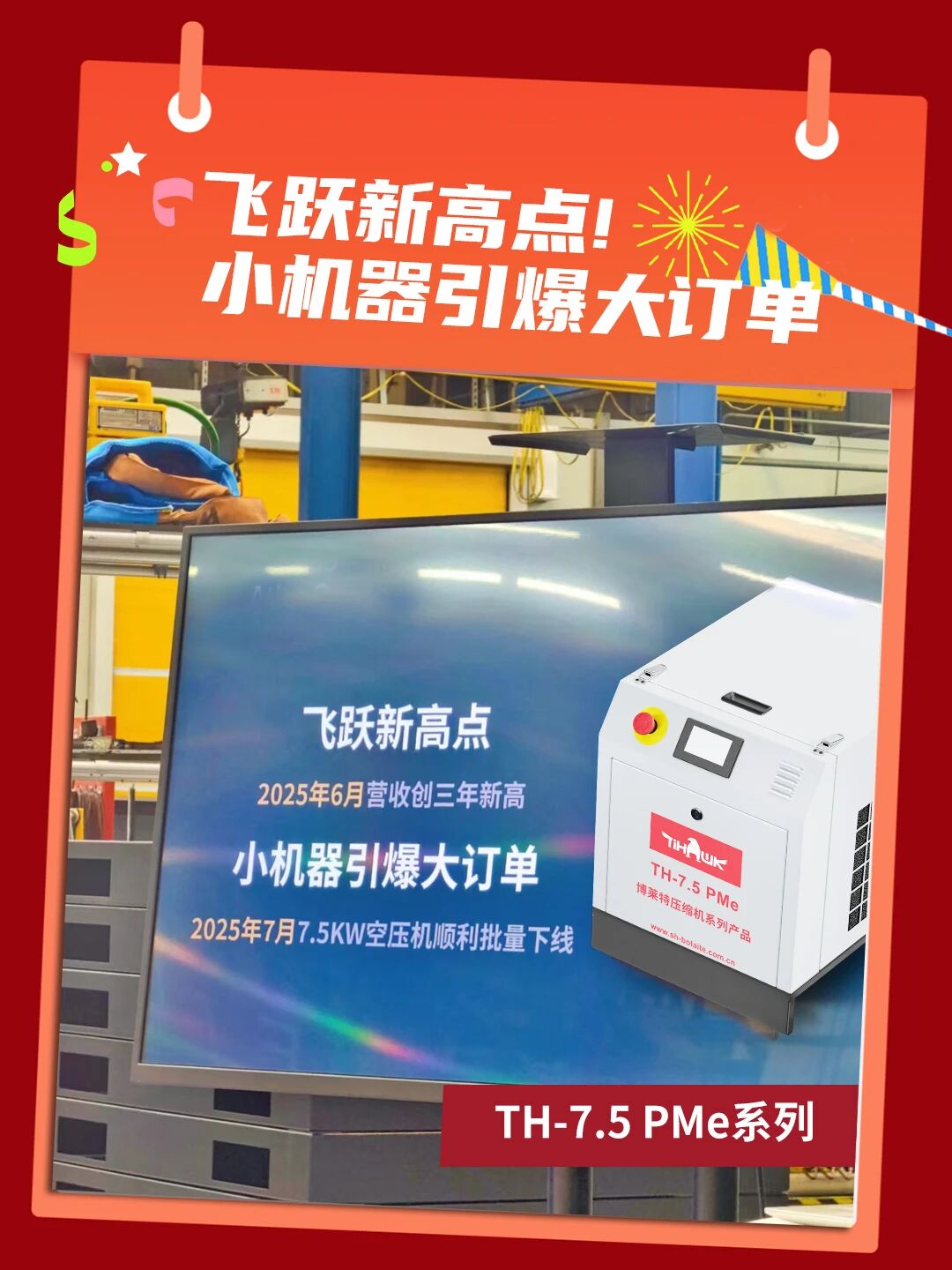 TH-7.5 PMe系列空压机新品上市即爆发!首月销量惊艳亮相,引爆大订单,用实力印证“小身材藏大能量”。高能效、低能耗的硬核实力,让订单接不停!这波新品热潮,你跟上了吗?抢占先机,就趁现在!